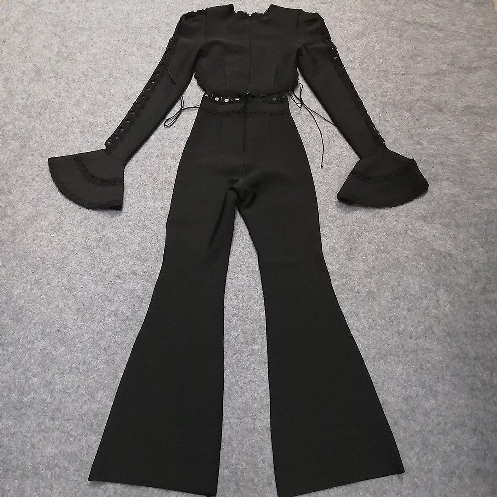 Women Tight Bandage Suit Long Sleeved Top Bell Bottom Pants Two Piece Set