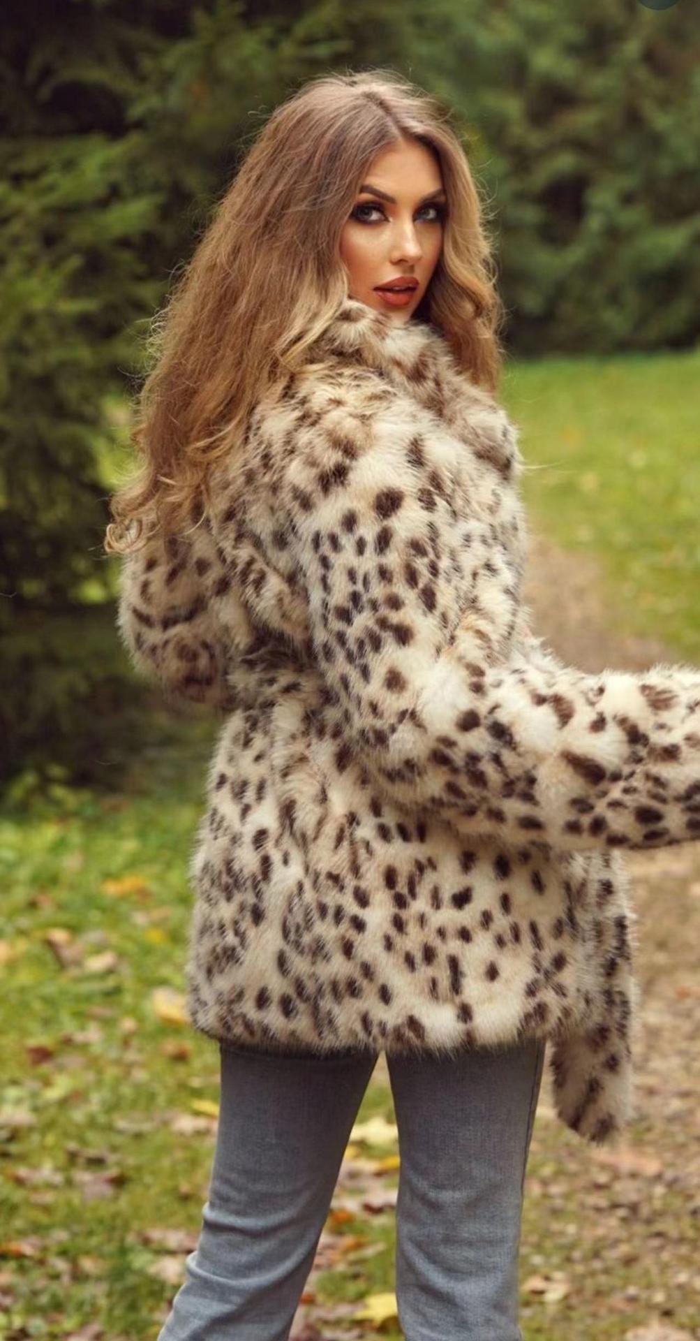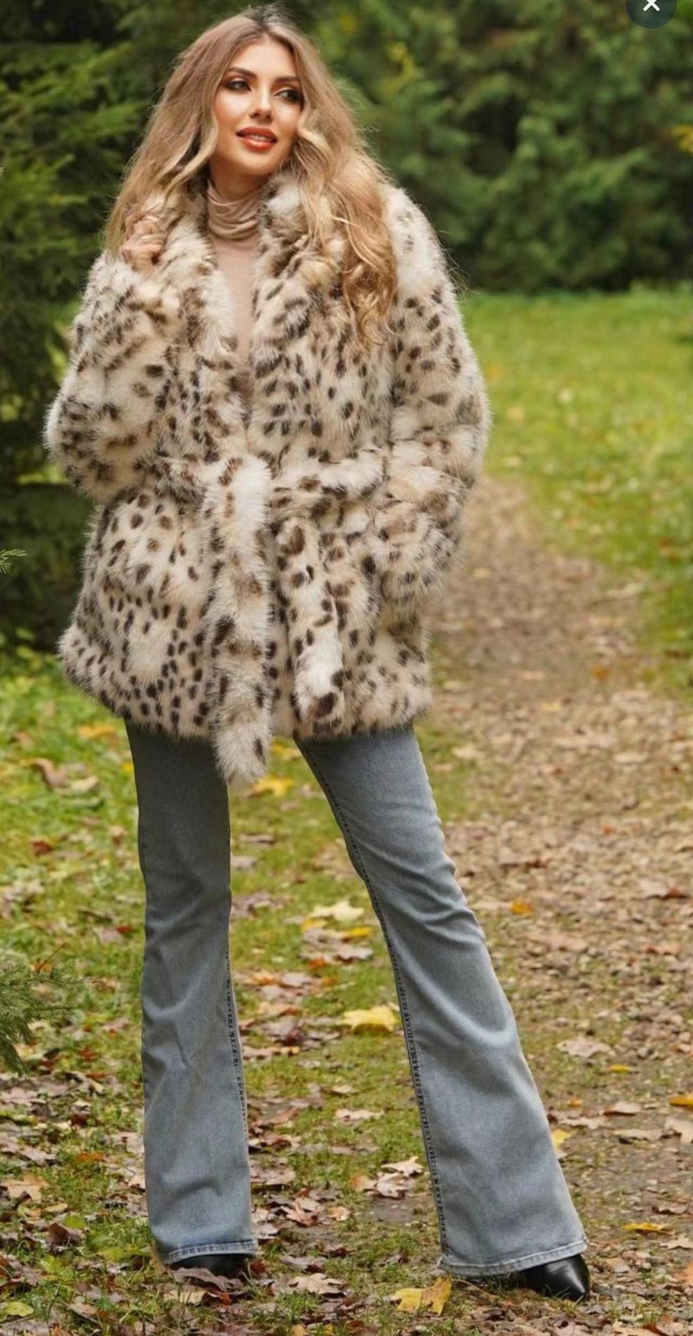 Autumn Winter Faux Fur Leopard Print Coat Collar Belt Mid Length Top for Women