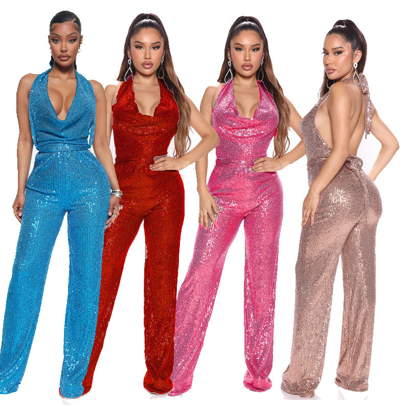 Autumn Winter Women Clothing Sleeveless Halter Sequined Lace up Jumpsuit with Belt