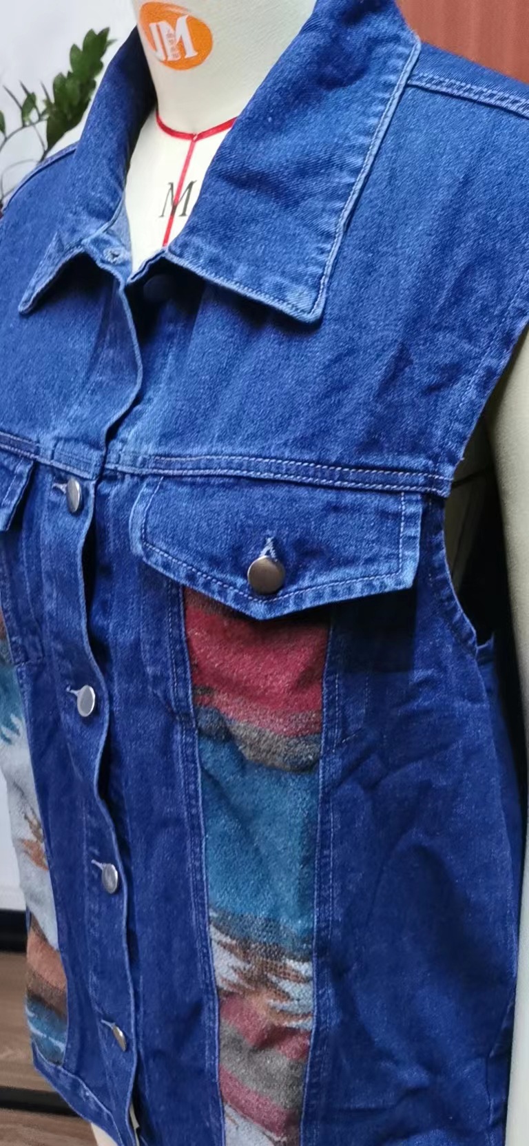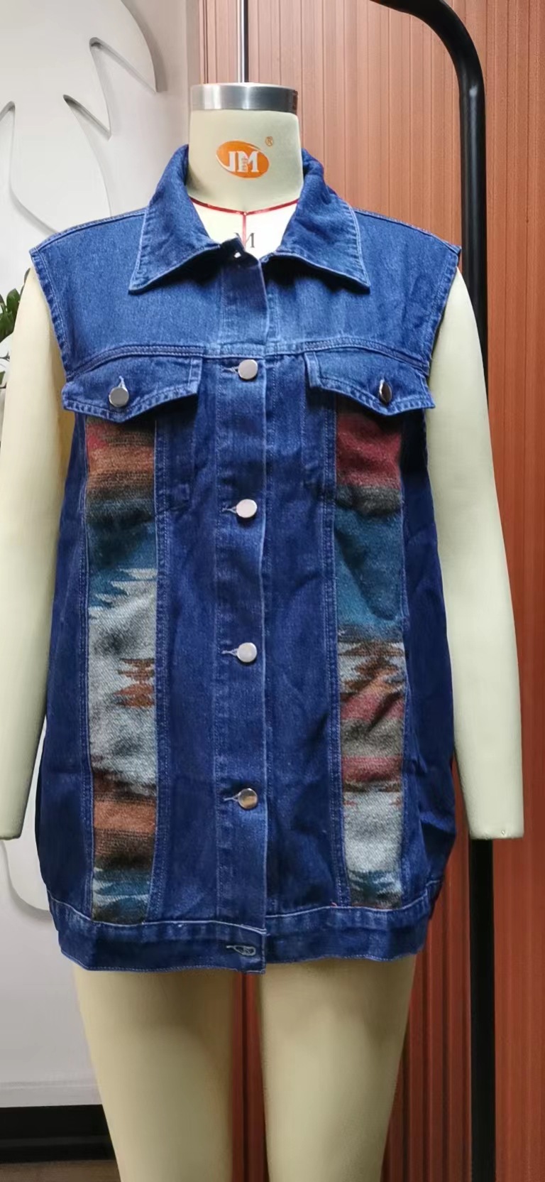 Geometric Abstract Denim Color Matching Vest Coat Loose Casual Women