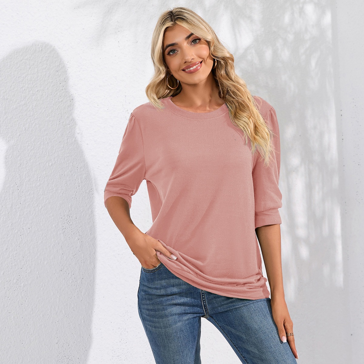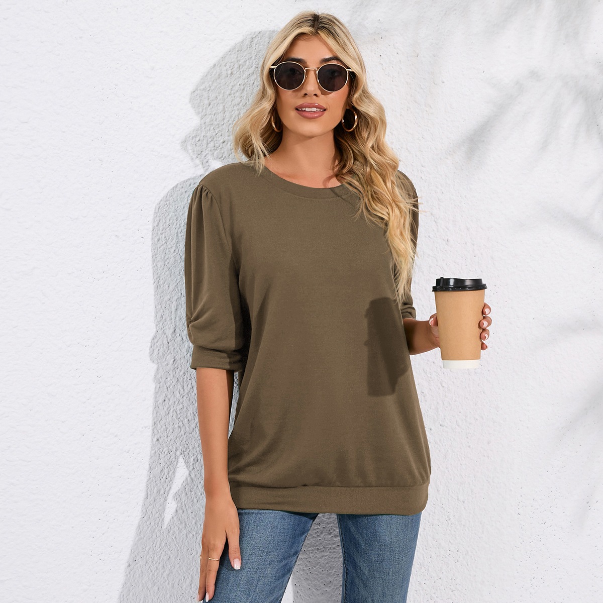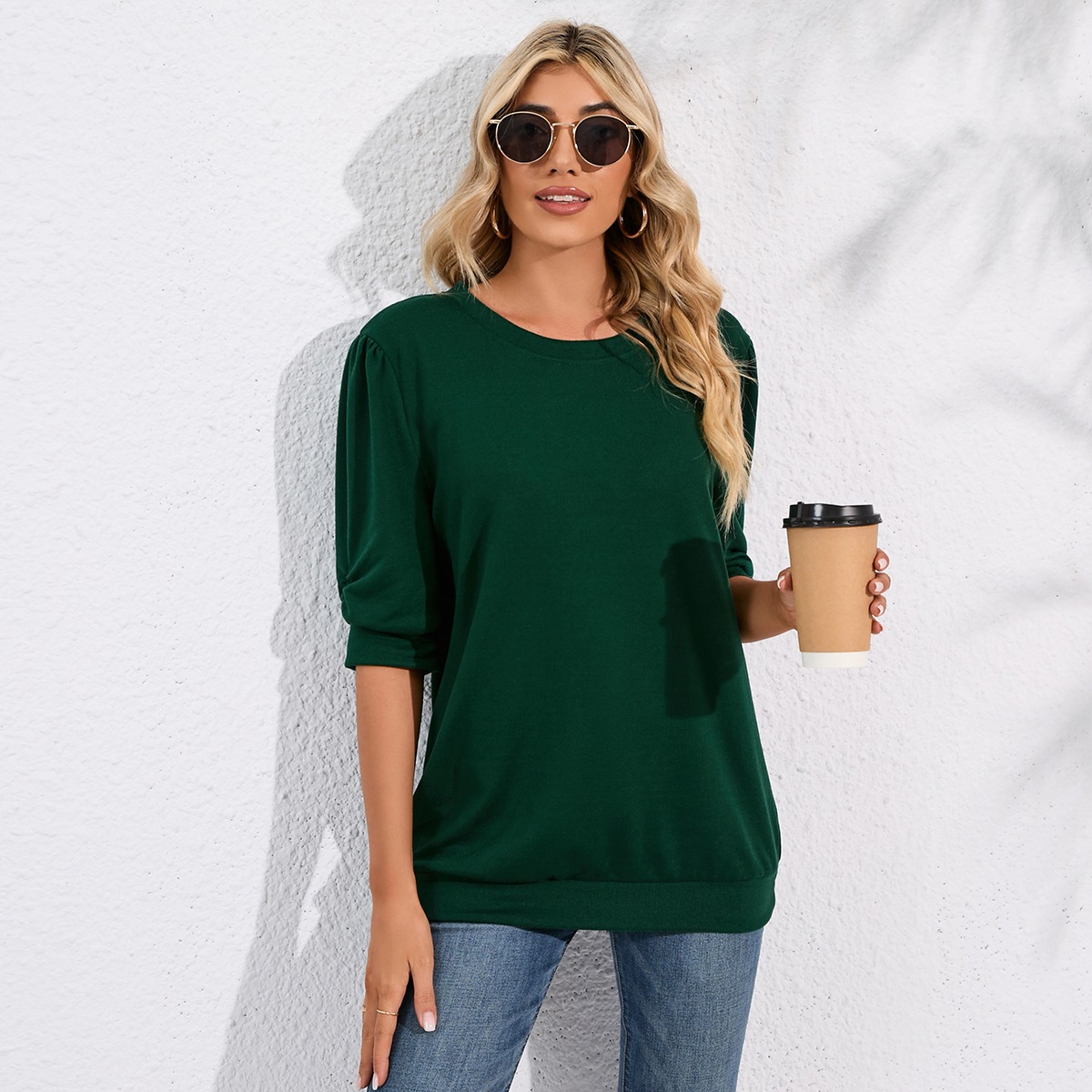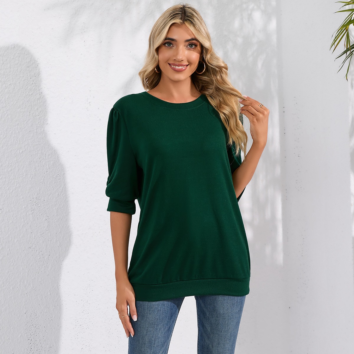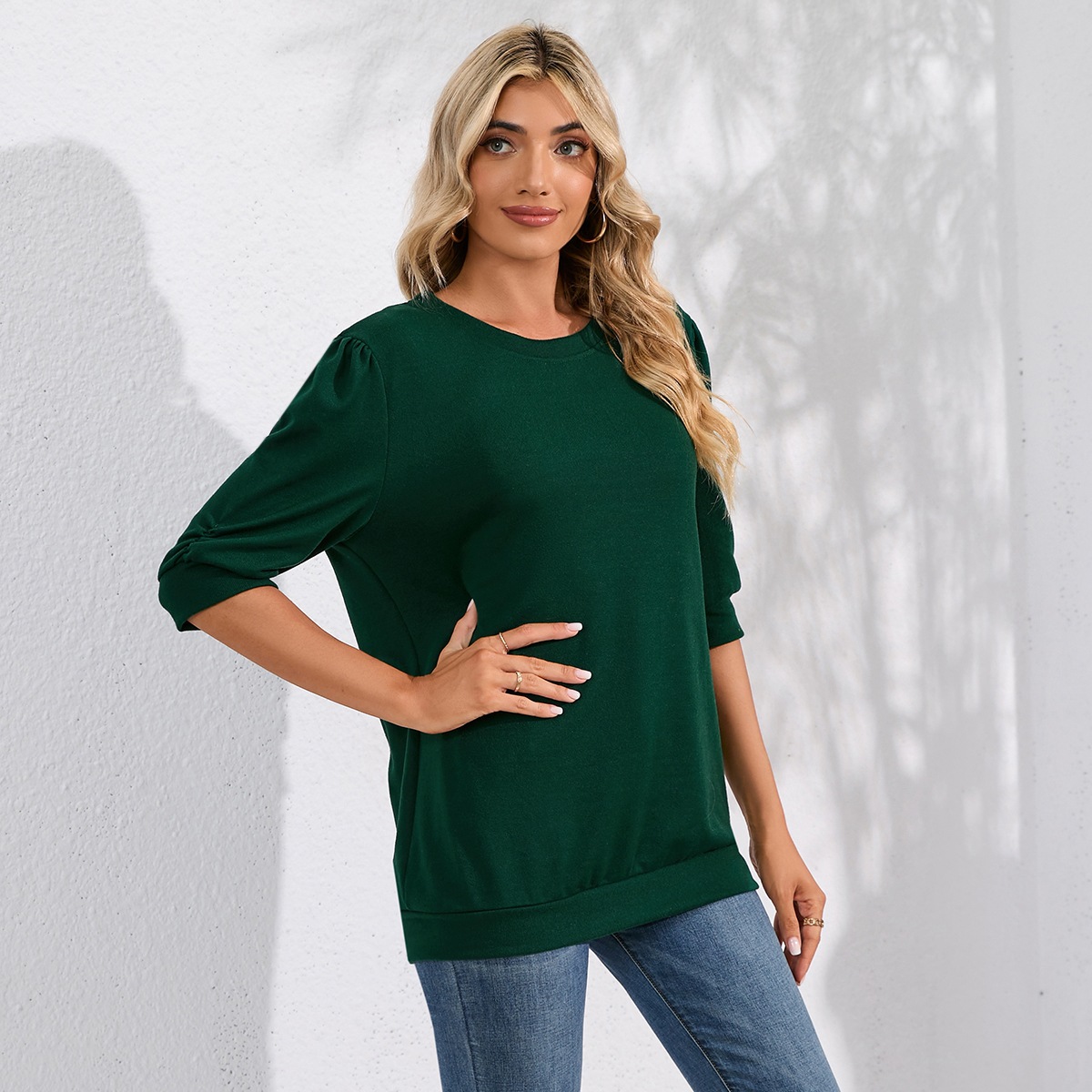 Solid Color Half Sleeves Knitwear Round Neck Puff Sleeve All Matching Hoodie