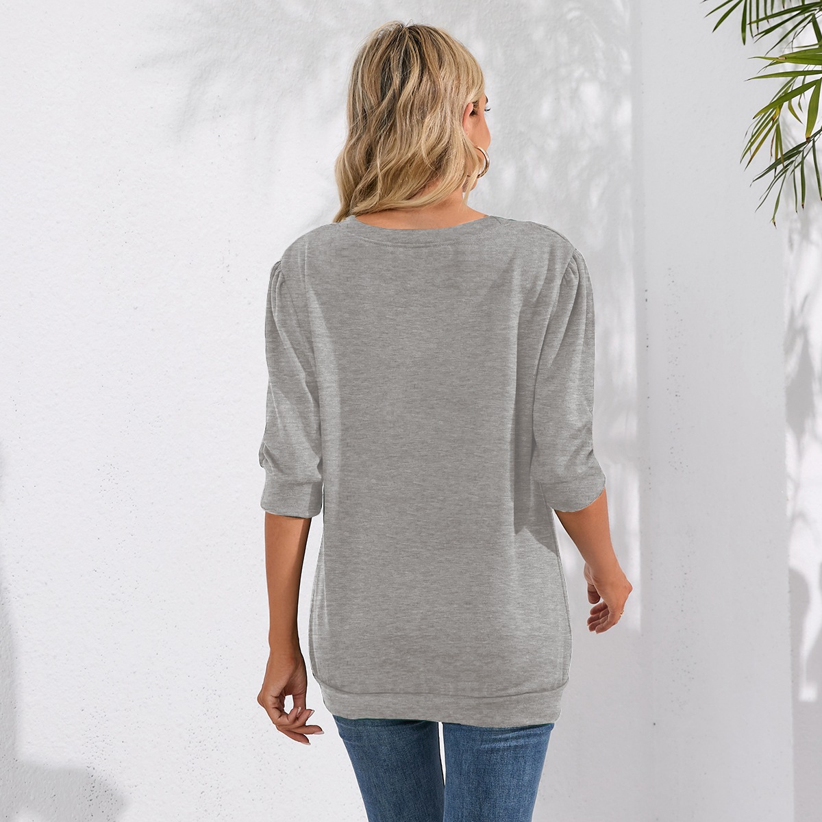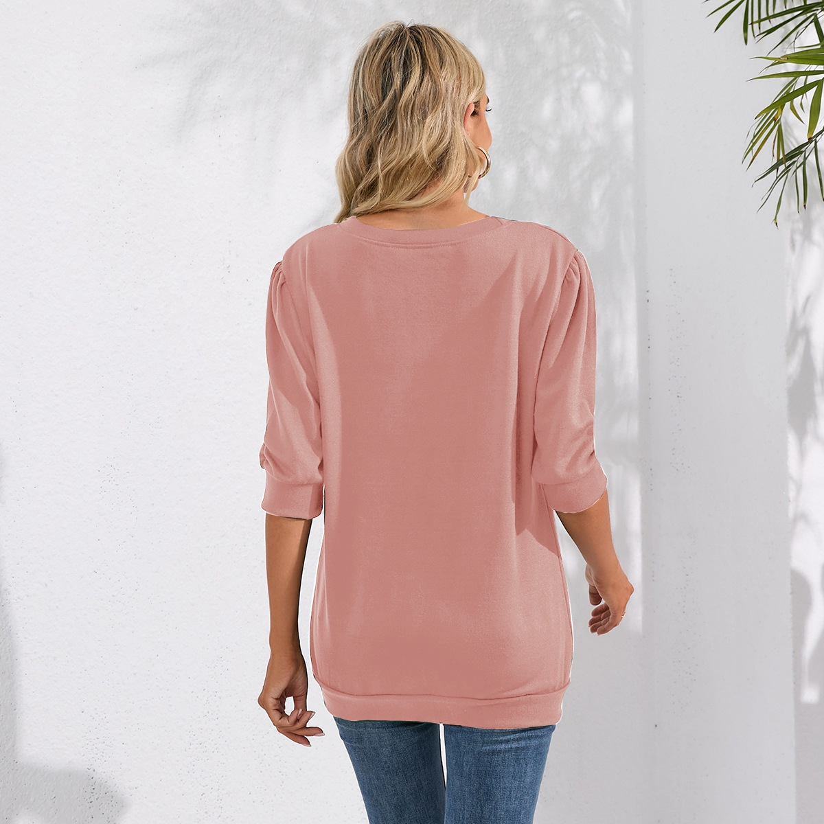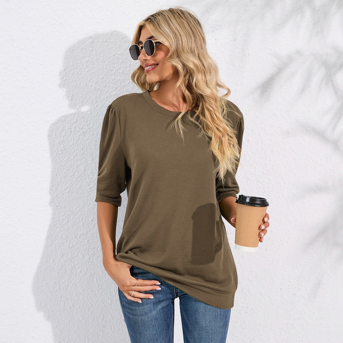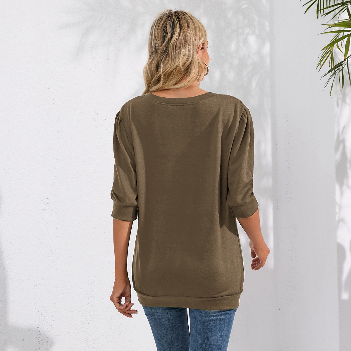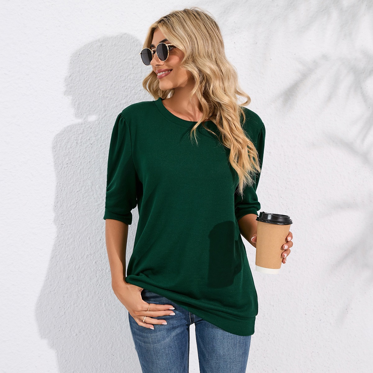 Solid Color Half Sleeves Knitwear Round Neck Puff Sleeve All Matching Hoodie