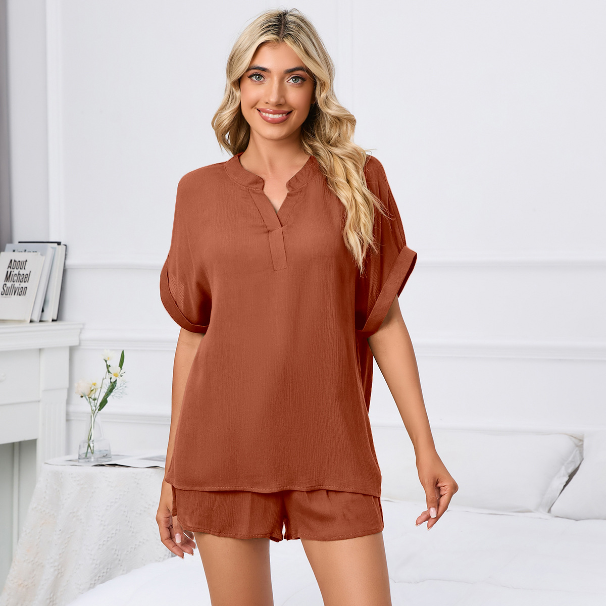 Spring Summer Solid Color V neck Loose T shirt Shorts Home Casual Suit