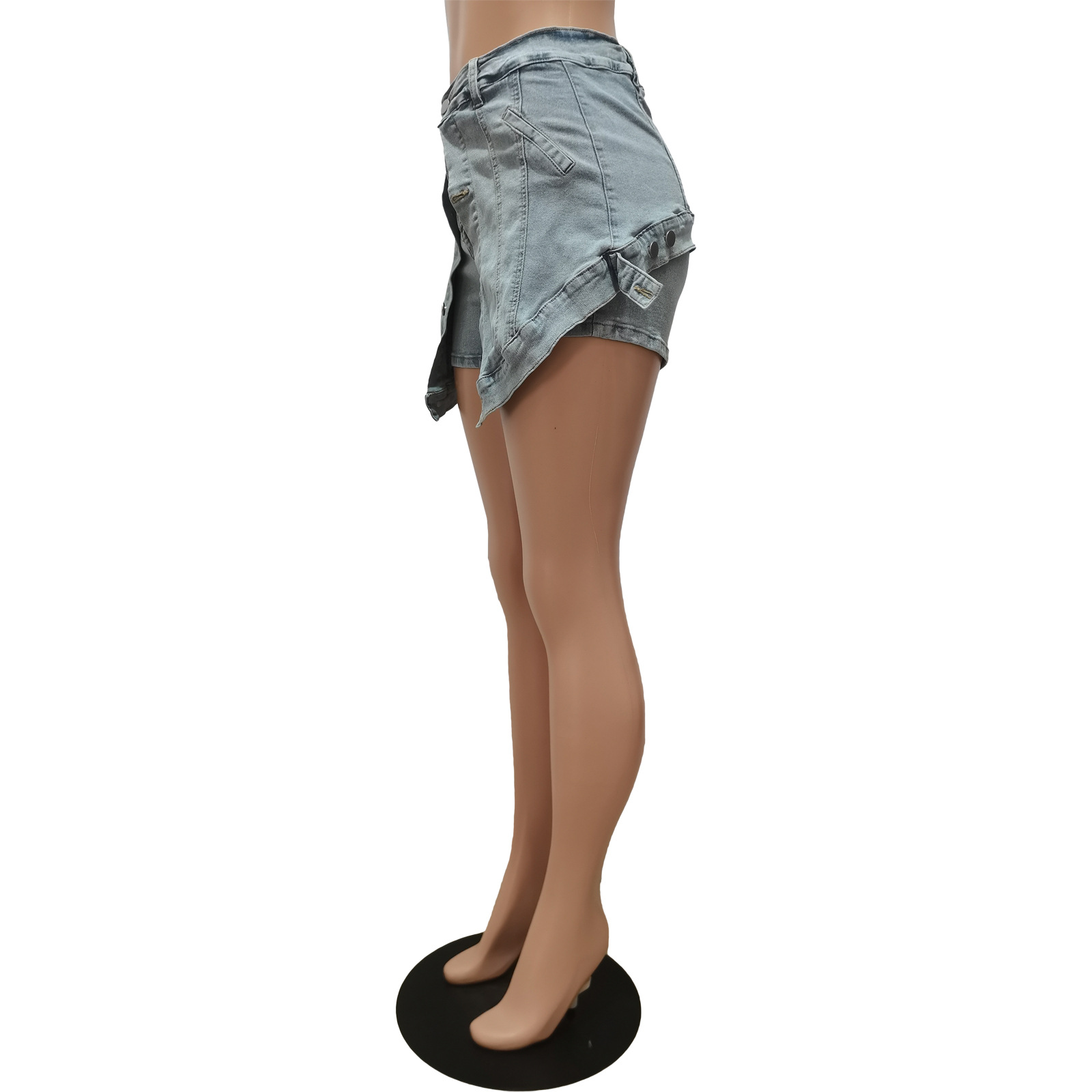 Women Clothes Elastic Denim Button Faux Two Piece Elastic Waist Denim Short Pantskirt