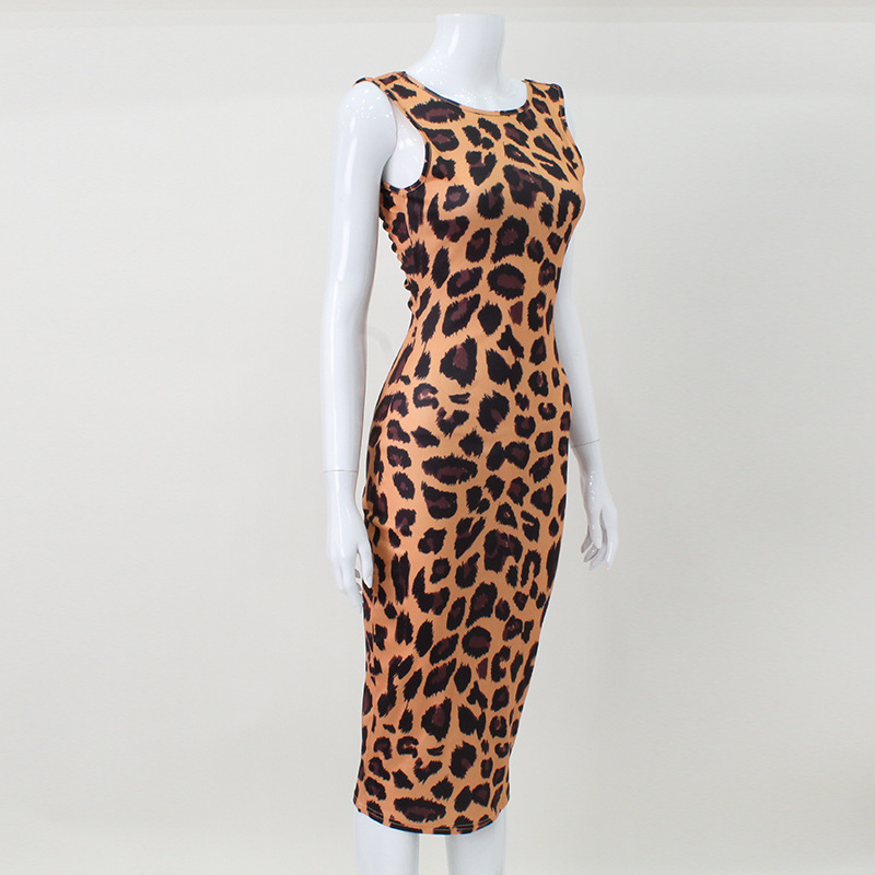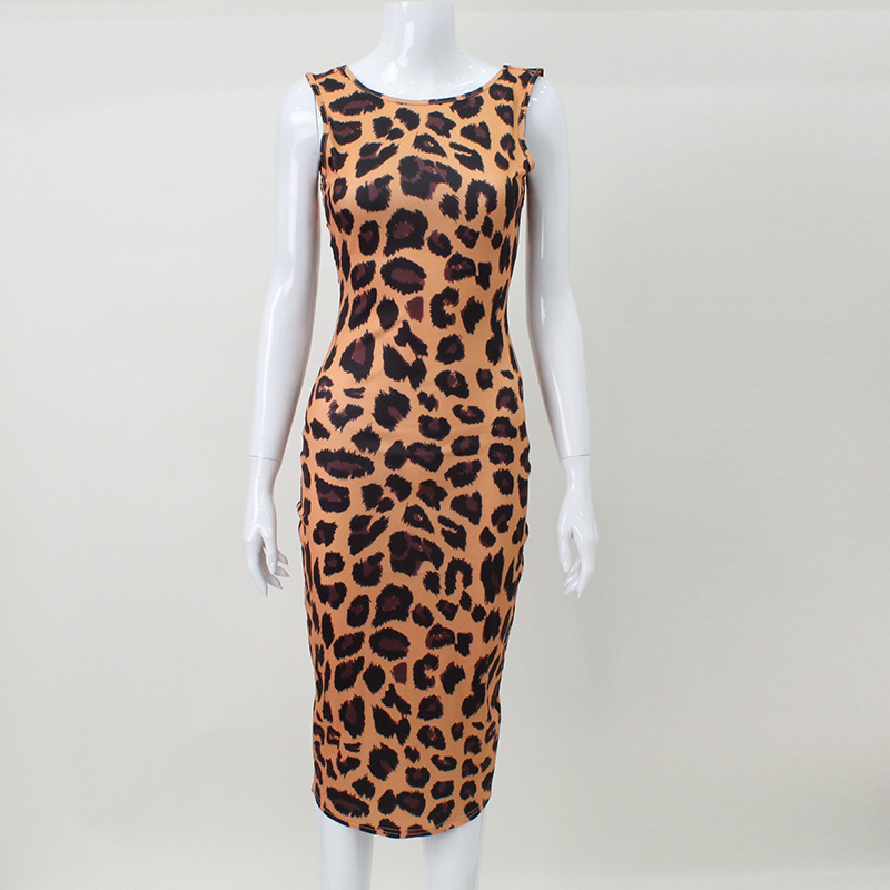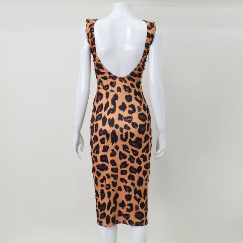 Women Clothing Leopard Print Sexy Dress Sleeveless Vest Bare Back Sexy Hip Dress Midi Dress