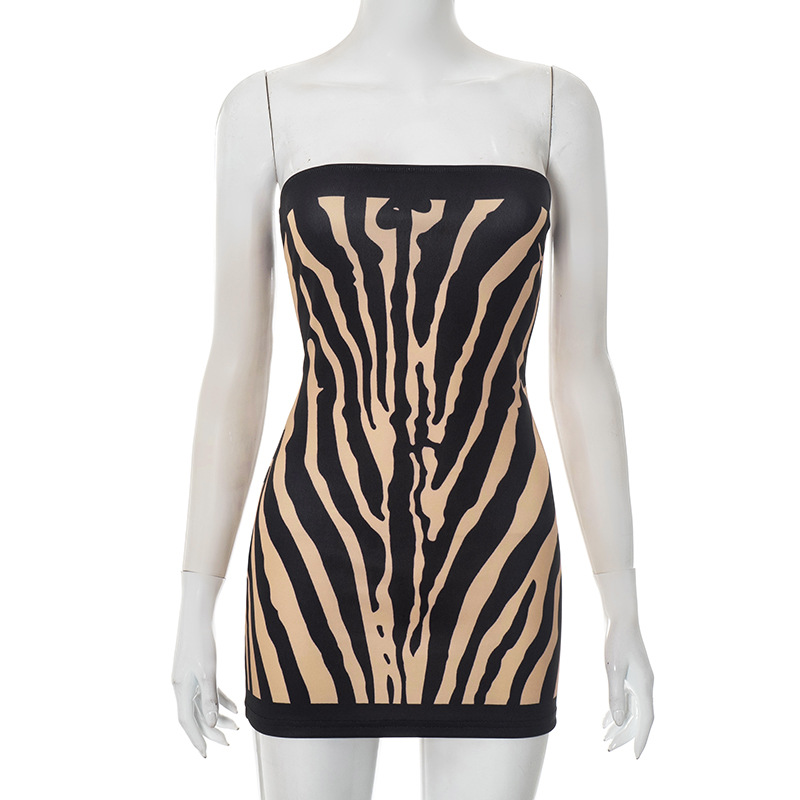 Women Sexy Zebra Print Tube Top Backless Slim A line Dress
